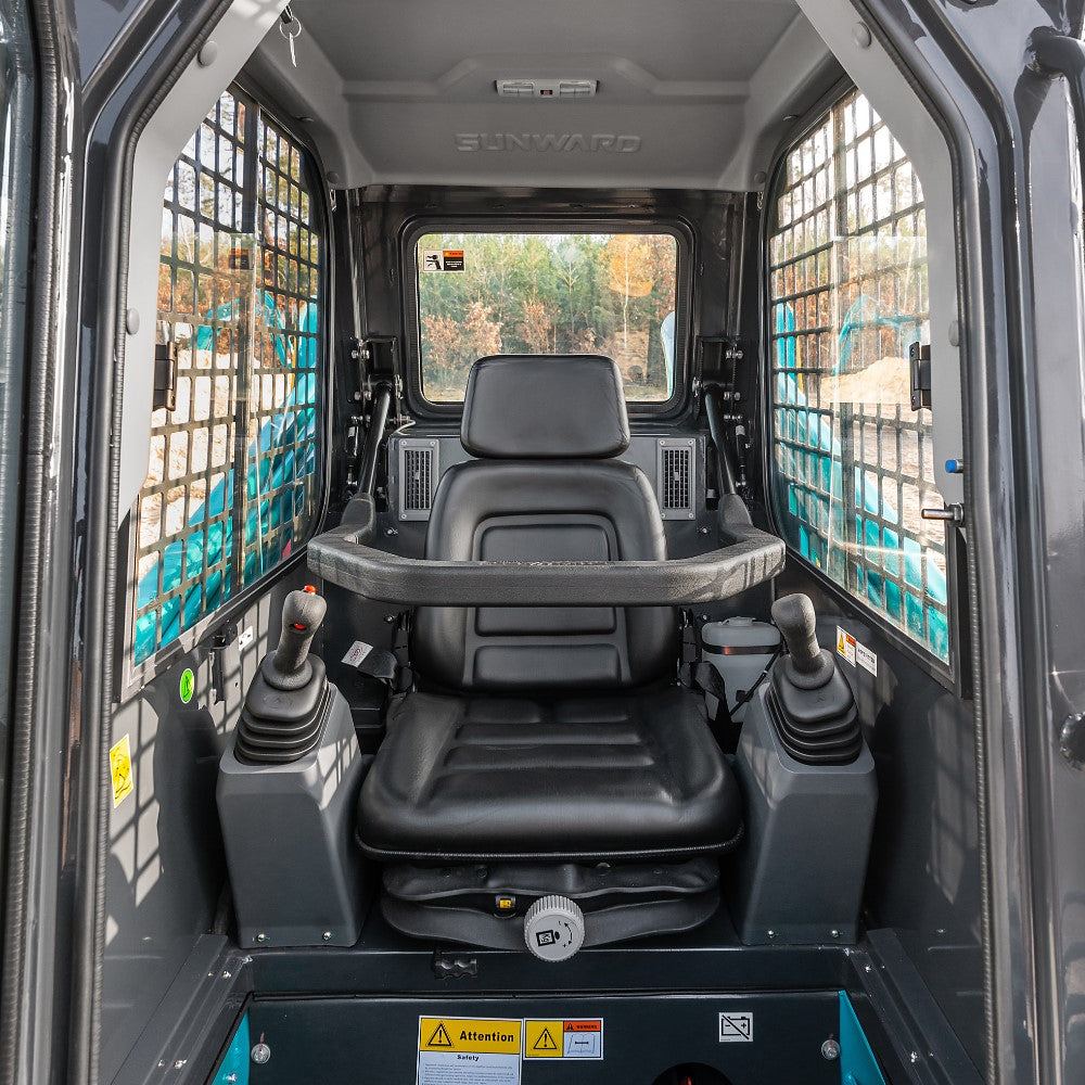 Comfort of the Sunward SWL 3230 starts with the easy cab access. Once seated, the SWL 3230 offers a spacious cab, air conditioning, a comfortable seat, and ergonomic controls for maximum operating comfort. Operators will be also impressed by the excellent all-around visibility. It is a real pleasure to operate a Sunward skid-steer.