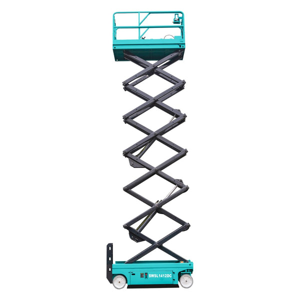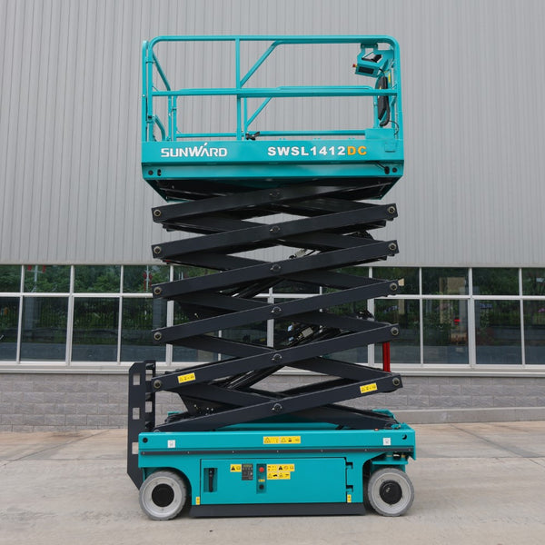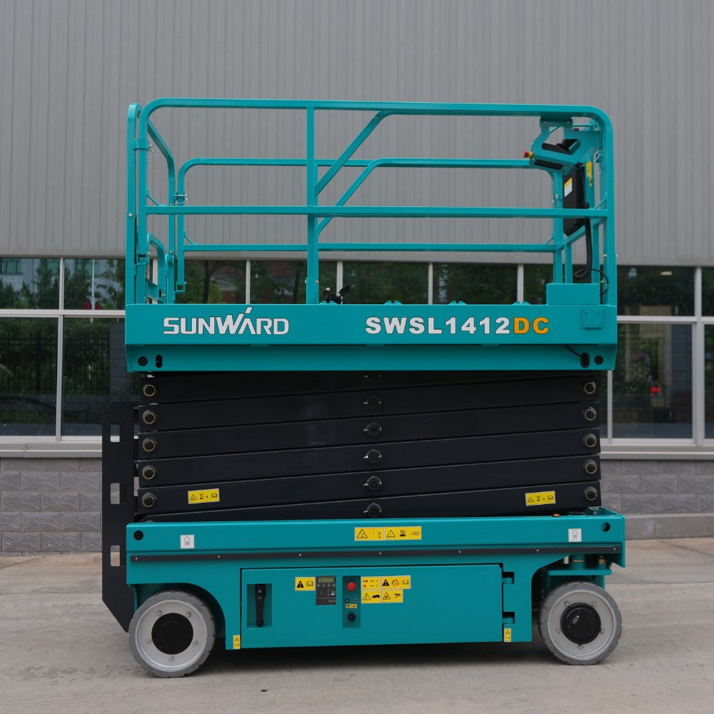The Sunward SWSL 1412DC electric scissor lift features a zero emissions electric drive, making it durable and cost-effective.